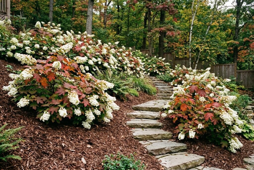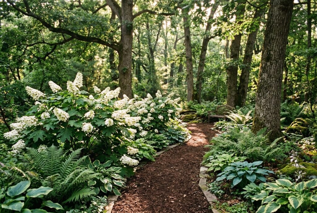 How to achieve this look: Plant Oakleaf hydrangeas along the edge of a wooded area or beneath large shade trees. To complete the woodland aesthetic, surround the base of the hydrangeas with shade-loving companion plants like hostas, ferns, coral bells (Heuchera), and bleeding hearts. Add a thick layer of natural cedar or pine bark mulch to retain moisture and mimic the forest floor.