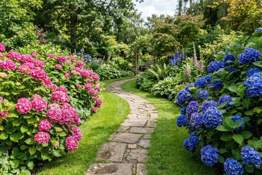 Because bigleaf hydrangeas change color based on soil pH, you can create a truly unique landscaping feature by intentionally altering the soil on either side of a garden pathway. This creates a whimsical, magical walkway where one side bursts with blue flowers and the other glows with pink.