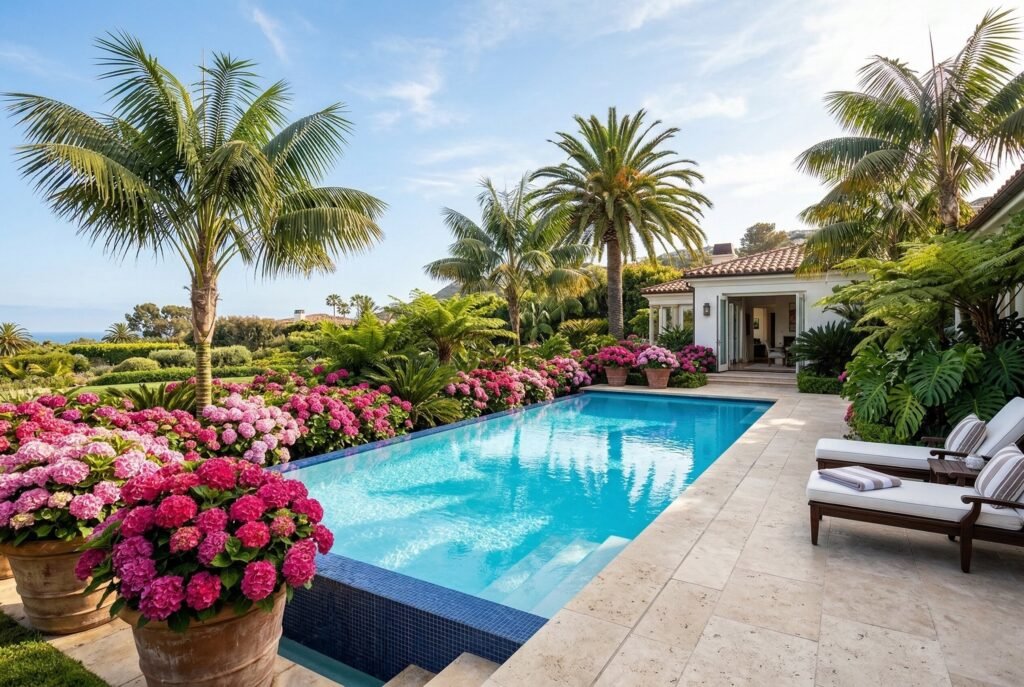 How to achieve this look: Choose heat-tolerant bigleaf hydrangeas or smooth hydrangeas. It is absolutely crucial that you do not plant them in the “splash zone” where chlorinated or saltwater from the pool will constantly hit their leaves and roots, as this will burn and kill the plants. Keep them set back a few feet from the pool edge, or keep them in large, raised decorative planters. Make sure they get afternoon shade, as the reflection of the sun off the pool water can scorch their leaves in the middle of summer.