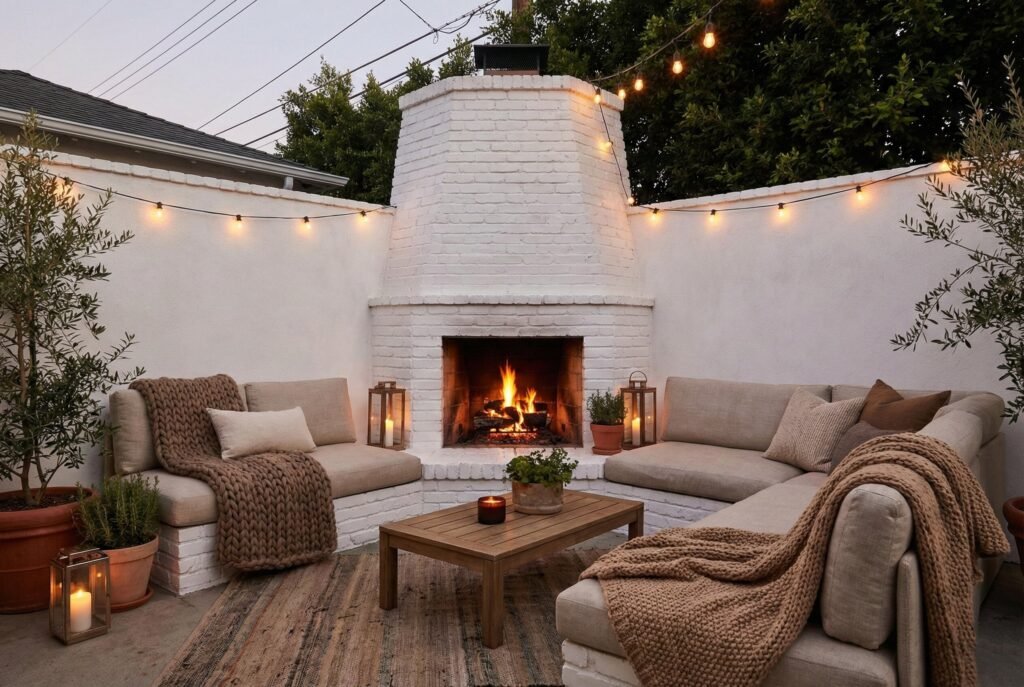 L-shaped seating works perfectly here. You can build a permanent bench seat that wraps around the corner, centered on the fireplace. This design creates a snug, protected feel, especially effective for blocking wind.
