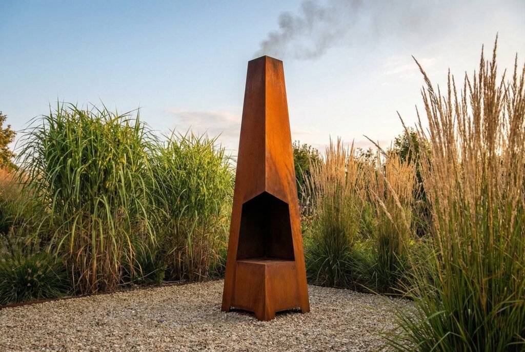These units are often sculptural. They can be tall and tapered or wide and boxy. Because the material is metal, it radiates heat efficiently. The rusty color contrasts beautifully with green grass and grey paving stones.