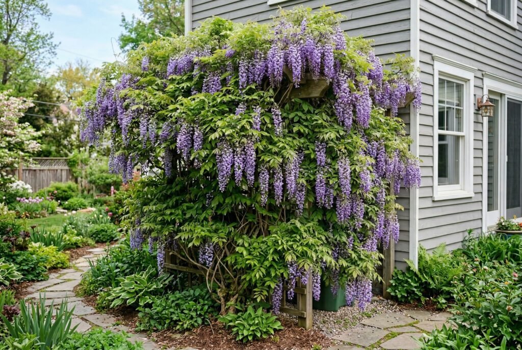 Instead of using hard screens or shrubs, you can create a structure specifically designed to support climbing plants. A simple trellis wall or a heavy-gauge wire fence can support native vines, such as native wisteria, climbing hydrangeas, or even useful plants like runner beans or small grapevines.