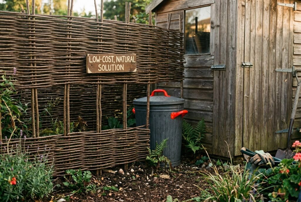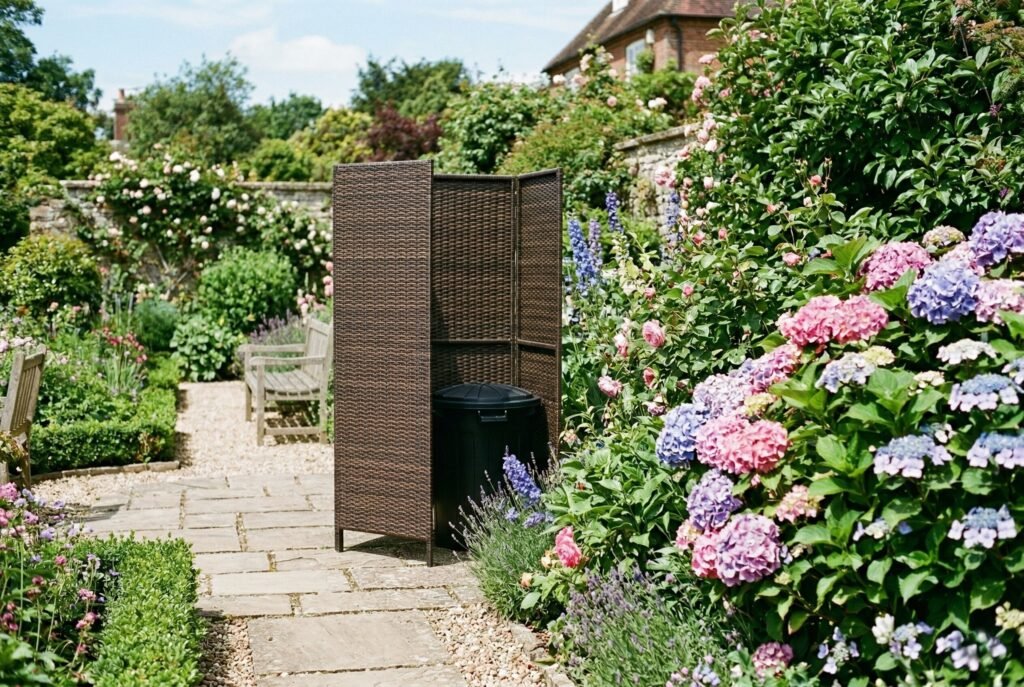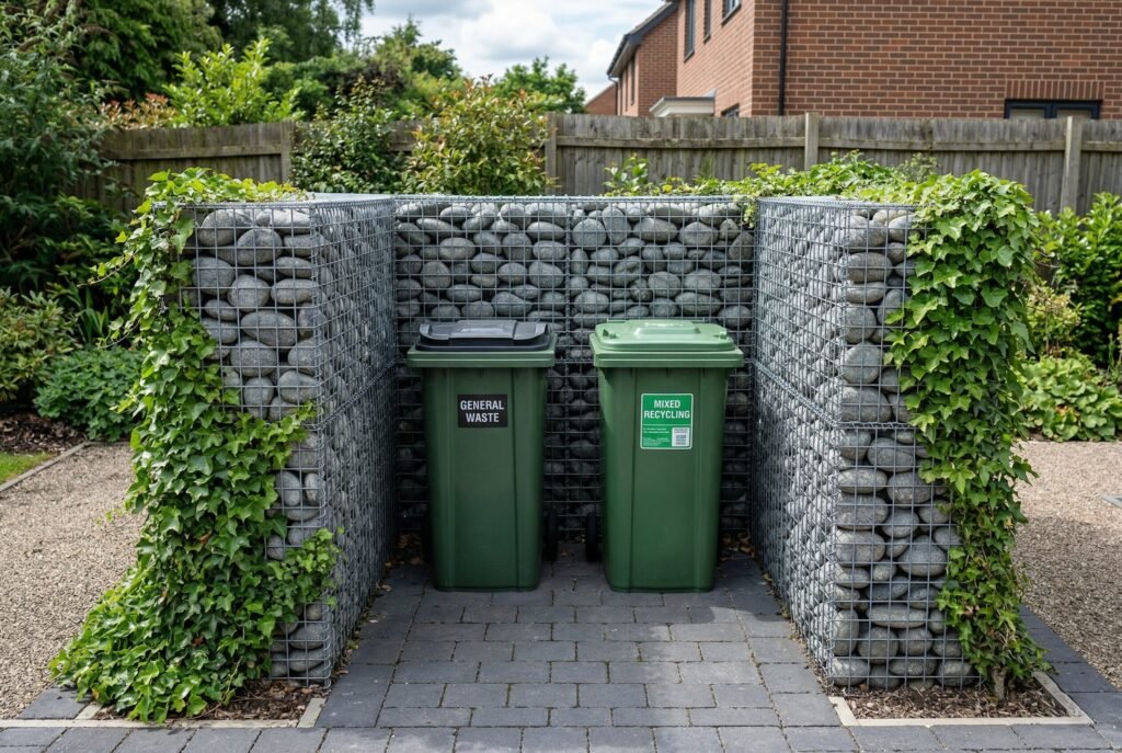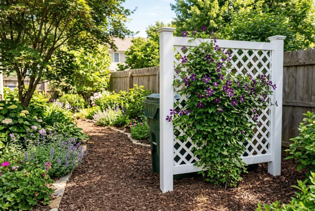 The crisscross pattern immediately breaks up the view. For an even softer look, this is an ideal spot to plant simple climbing vines like clematis or even a climbing rose. The vines will fill in the holes over time, creating a “living wall” that completely obscures the bins while providing natural ventilation.