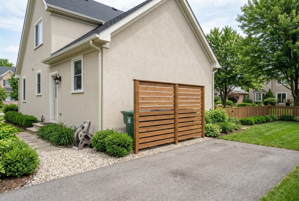 The simplest and most budget-friendly idea is to use what you already have. Look around your yard. Is there an awkward alcove at the corner of your house? Is there already a line of large, mature shrubs? You can create a “trash can nook” by either utilizing an existing space or planting a few strategic, dense evergreen bushes. This creates a natural, soft screen that doesn’t look like an obstruction.