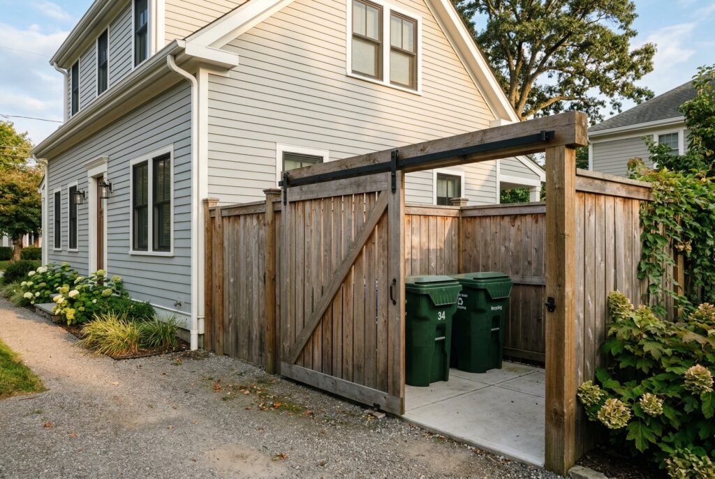 If you already have a side gate or a section of a privacy fence, you can create a simple alcove and use a sliding barn-style door. This approach is simple to build because you don’t need precise hinges or framing for a swinging door. You simply install a sturdy overhead track and the door panel, which can be made of simple fence pickets. This is an easy way to fully conceal your bins without a large, swinging door that blocks your driveway.