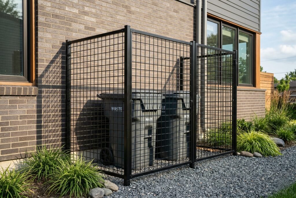 These grids are strong but maintain a very light and airy visual footprint. Because they are open grids, they offer the absolute best ventilation. Like the lattice idea, this is a perfect support for climbing plants. The black or silver metal grids look fantastic against green foliage, making your trash area disappear.