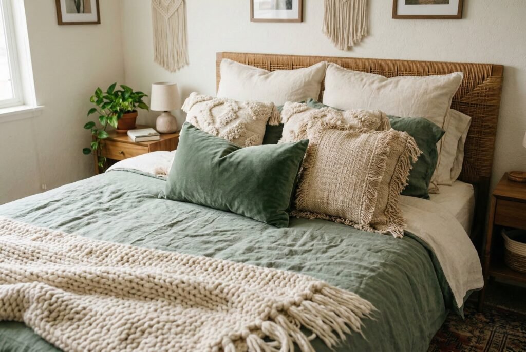 Boho design is deeply rooted in texture. If your room feels flat, you need to layer your fabrics. On a bed with a sage green duvet, pile on tufted throw pillows, fringed cushions, and a chunky knit throw blanket. Mix materials like cotton, linen, wool, and velvet. The color palette can remain simple, greens, creams, and tans, but the heavy use of different textures will make the room feel incredibly luxurious and bohemian.