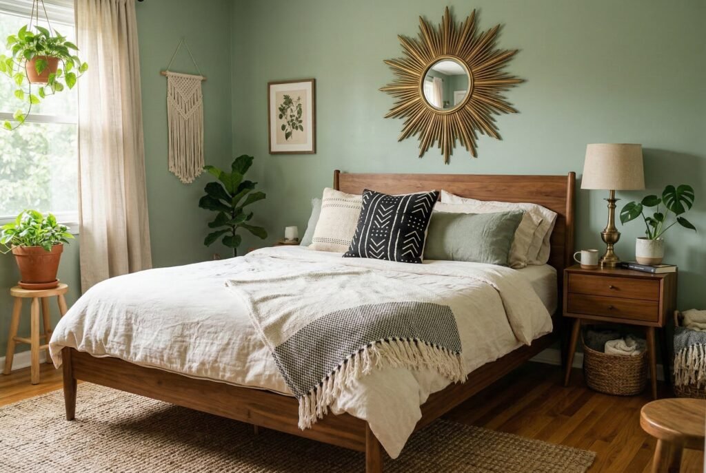Boho style blends effortlessly with mid-century modern furniture. Look for a bed frame and dressers made of warm walnut or teak wood with clean, tapered legs. The rich brown tones of mid-century wood look incredibly sophisticated against sage green walls. Add a vintage mid-century sunburst mirror above the bed and use a textured mudcloth pillow to introduce the bohemian aesthetic.