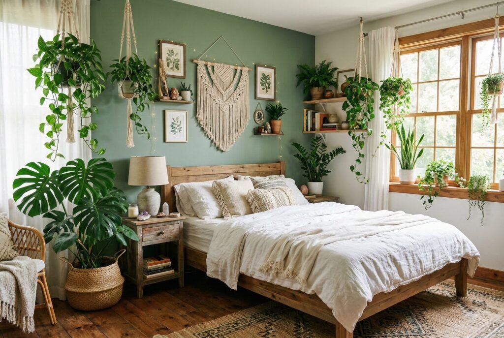 Bringing the outdoors inside is a staple of bohemian design. By pairing sage green walls with a lush collection of indoor plants, you create a seamless transition between nature and your sleeping space. Use large floor plants like Monstera or Fiddle Leaf Figs in the corners, and hang trailing plants like Golden Pothos from macrame plant hangers near the windows. The living green foliage pops beautifully against the muted sage paint, doubling down on the earthy aesthetic.