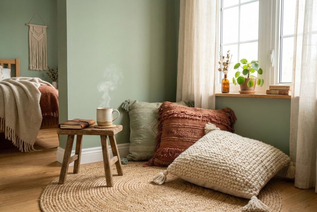 Every boho bedroom needs a space dedicated to relaxation, reading, or meditation. Choose a sunny corner of your room and paint it sage green. Throw down a thick jute rug and arrange several large, oversized floor pillows or a low-profile velvet floor cushion. Add a small wooden stool to hold a cup of tea or a book, creating a tranquil bohemian lounge area within your bedroom.