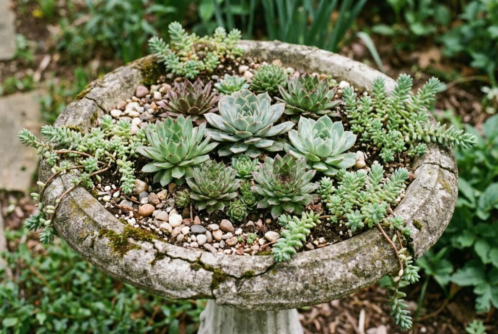 How to do it: If the birdbath bowl doesn’t hold water anymore, it’s perfect for succulents. Drill a drainage hole if one isn’t present. Fill the shallow bowl with succulent soil. Create a miniature rock landscape inside the bowl using small pebbles and tiny succulent plugs. Place the birdbath as a feature piece in a garden bed surrounded by larger rocks.