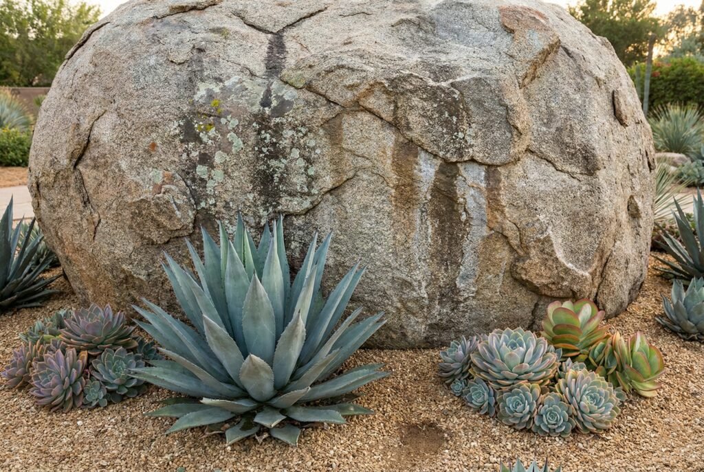 How to do it: Place your largest boulder in a prominent spot. This is your focal point. Plant larger succulents, like a medium-sized Agave or a tall Aloe, right next to the base of the boulder. Fill the surrounding area with smaller gravel and scattered medium stones. The big rock provides a backdrop that makes the plants pop.