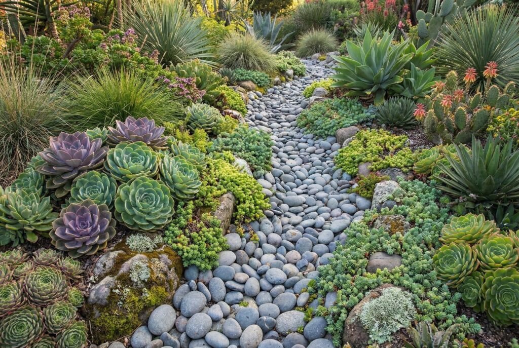 How to do it: Clear a winding path through your garden area. Lay down landscape fabric to stop weeds. Fill the path with medium-sized, smooth river stones. Plant clusters of low-growing succulents like Sedum or Sempervivum along the “banks” of your stone river. Add a few larger boulders at curves for a natural look.
