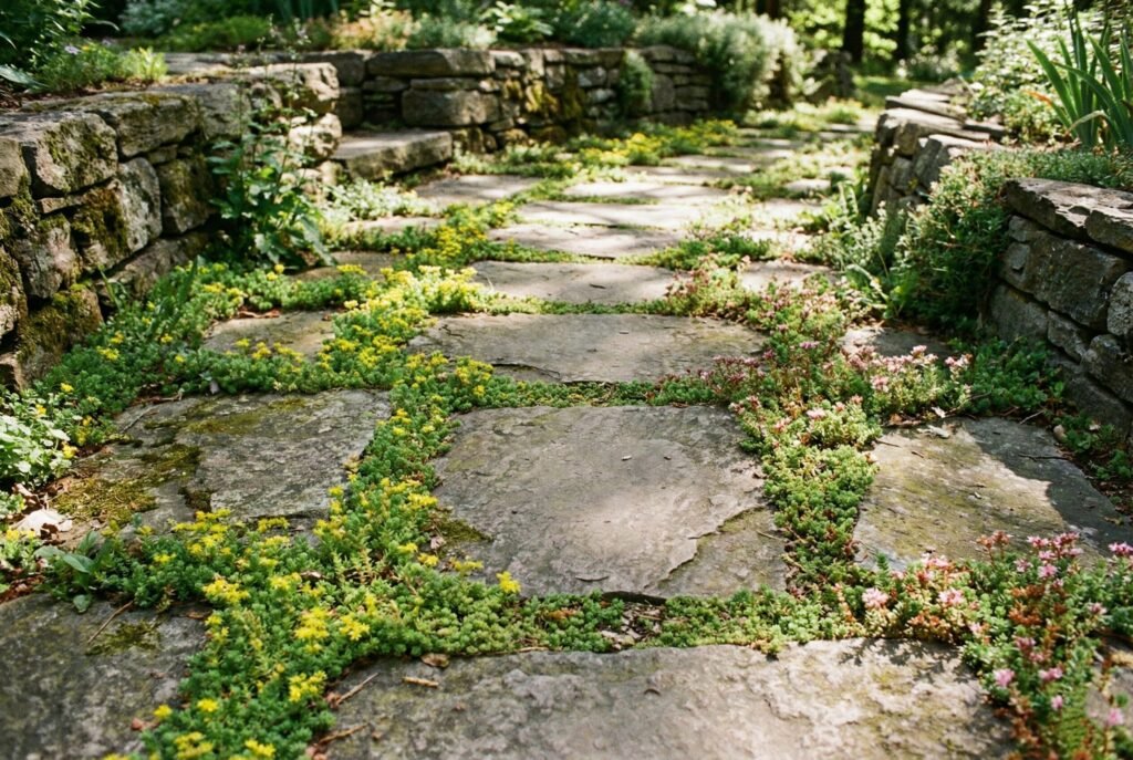 How to do it: Lay down large, rectangular flagstones to create a pathway, leaving about two to three inches between each stone. Excavate the soil between the stones slightly and fill it with gritty soil. Plant low-growing, tough groundcover succulents like creeping thyme (not a succulent but works well) or durable Sedum varieties that can tolerate occasional foot traffic.