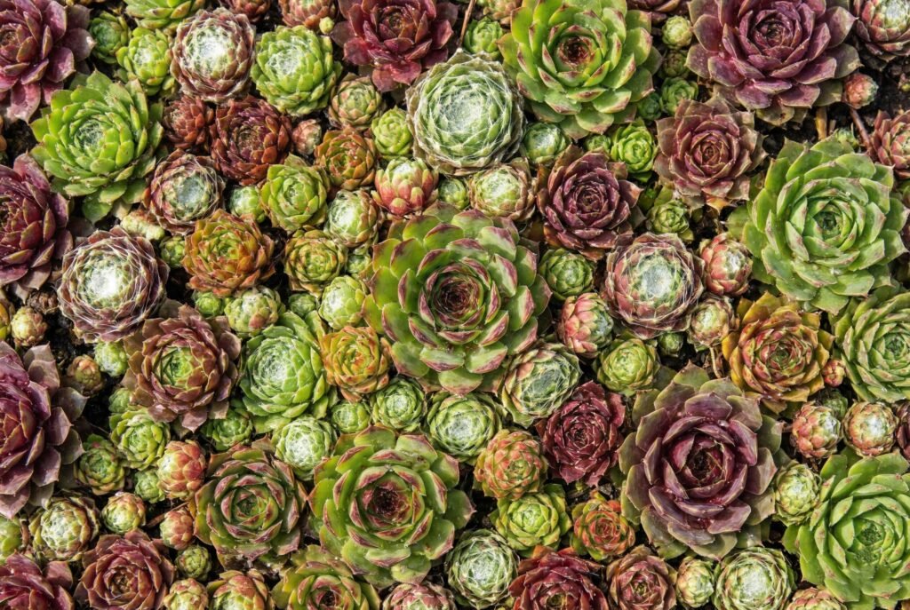 Sempervivum, known as Hens and Chicks, naturally form tight clusters that look like living mosaics.