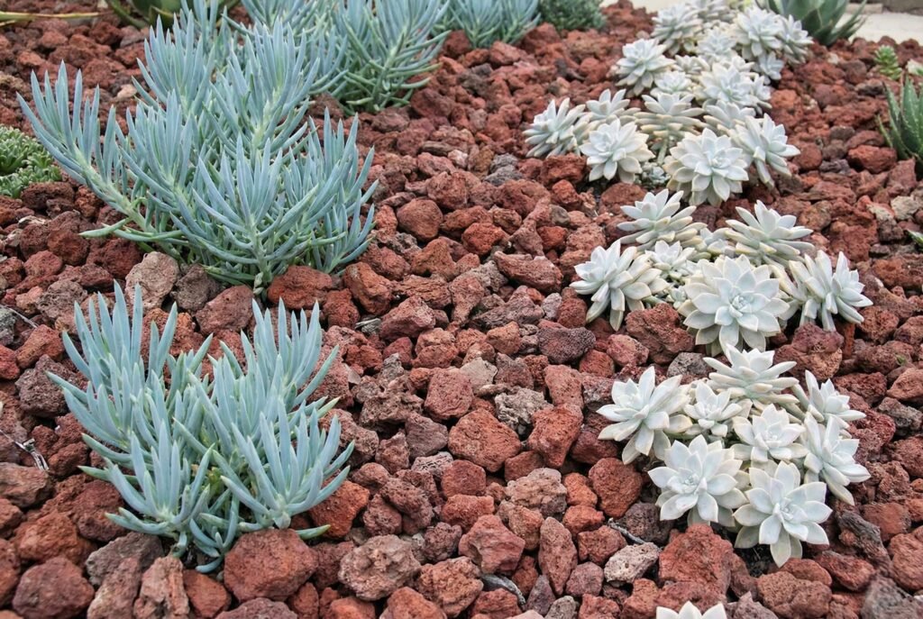 How to do it: Cover your garden bed entirely with red lava rock pebbles. Plant succulents that have pale green, blue, or silvery foliage. Blue Senecio, pale ghost plants (Graptopetalum paraguayense), or powdery white Dudleya look incredible against the dark, rough texture of the lava rock.