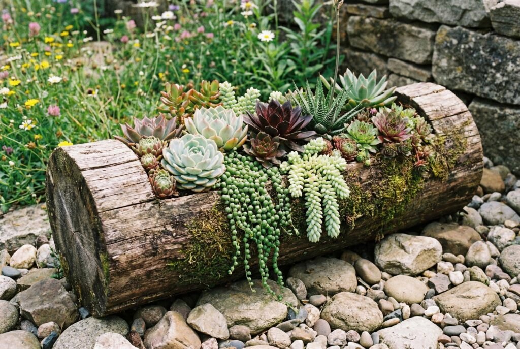 How to do it: Find a hollowed-out log or a piece of driftwood with a natural depression. Drill drainage holes in the bottom. Fill the cavity with succulent soil. Plant a mix of upright and trailing succulents. Place the log in your garden and surround its base with medium-sized fieldstones to anchor it into the landscape.