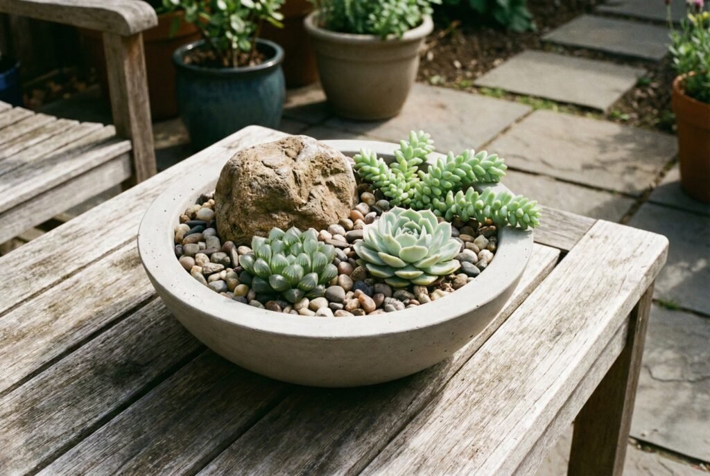 How to do it: Use a wide, shallow, bowl-shaped planter made of terracotta or concrete. Ensure it has drainage. Fill it with cactus mix. Place one main “boulder” (a fist-sized rock) in the pot. Arrange smaller stones around it. Plant three to five small succulents of varying heights around the rocks. Top dress exposed soil with fine aquarium gravel.
