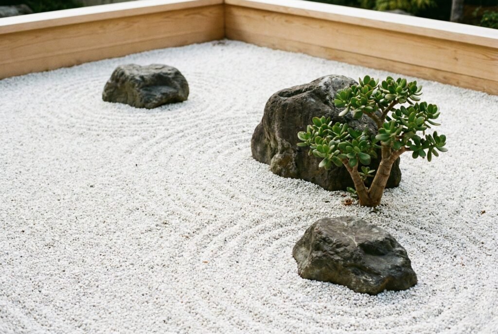 How to do it: Use fine, light-colored gravel as your base. Place three or five interesting rocks in an asymmetrical arrangement. Plant only a few sculptural succulents, like a small jade plant (Crassula ovata) or a smooth agave, near the rocks. Keep the design sparse. You can even use a small rake to create patterns in the gravel around the stones.