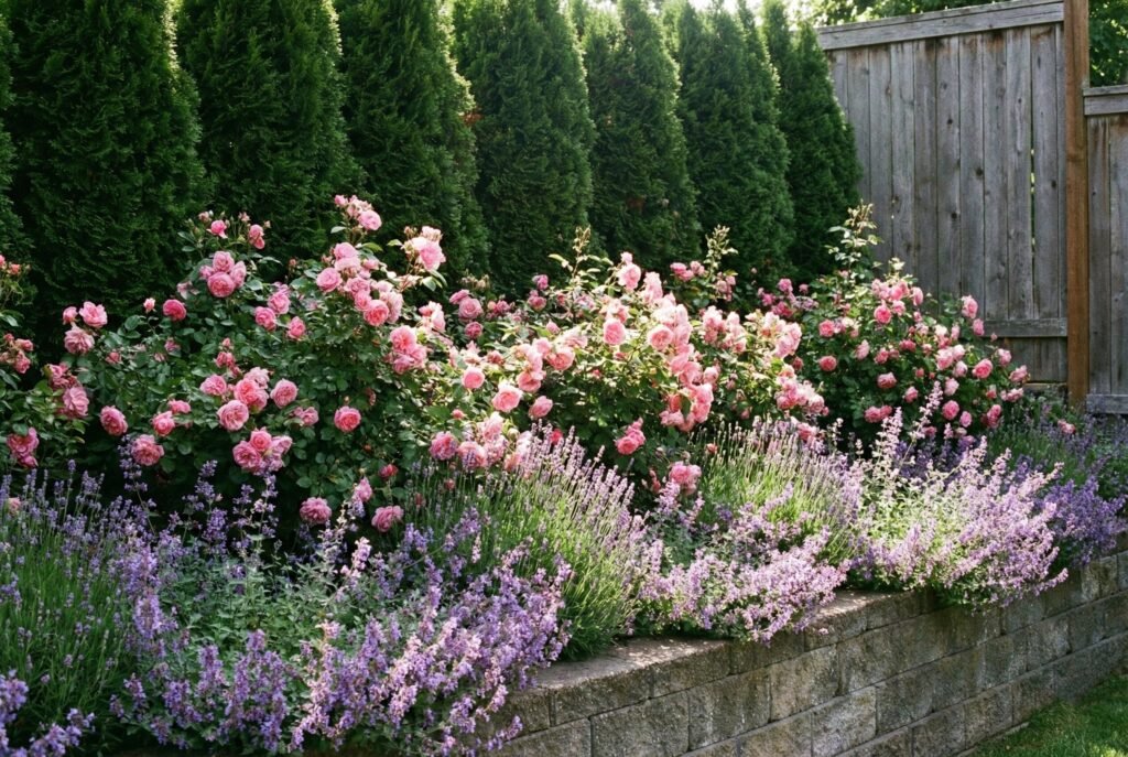 - Middle Layer: Flowering perennials (Roses, Hydrangeas).