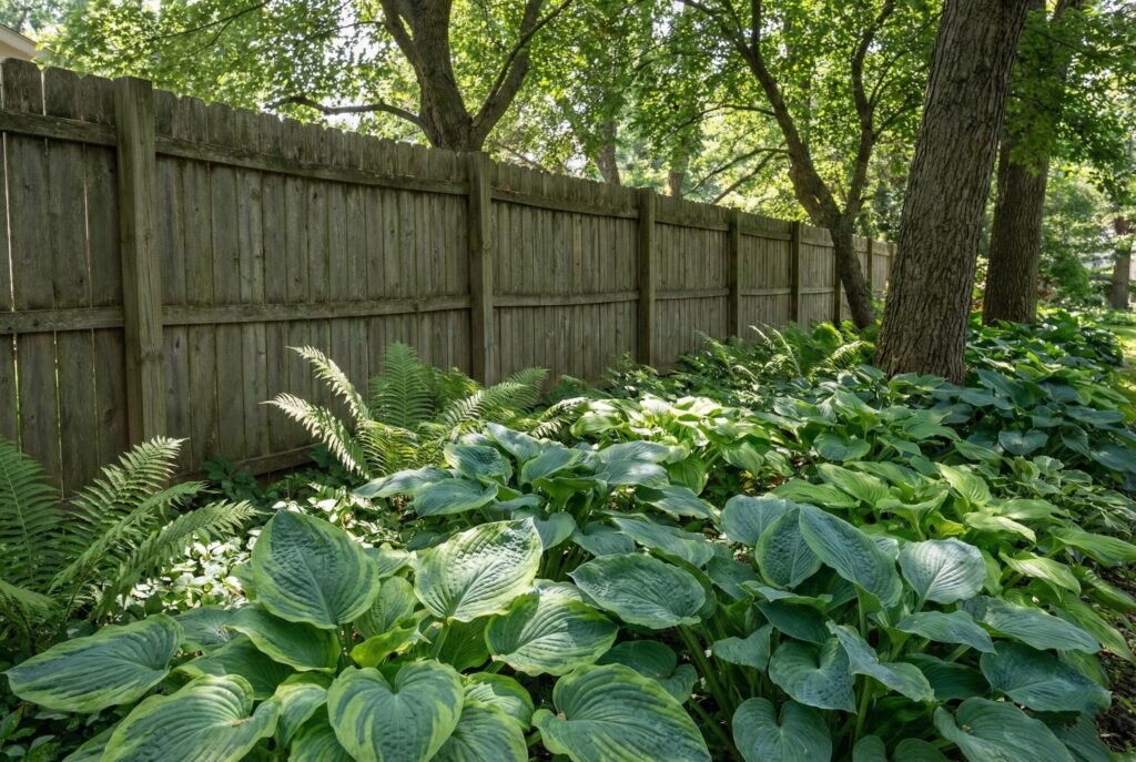 If your fence creates a dark, damp strip of shade, embrace it. Hostas and ferns love these conditions. They rely on foliage texture rather than flowers.