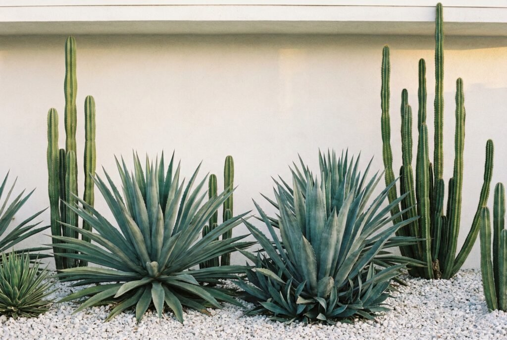 If you live in a desert area or have a very hot, dry wall, succulents are the answer. You can plant tall cacti or Agave along the base.