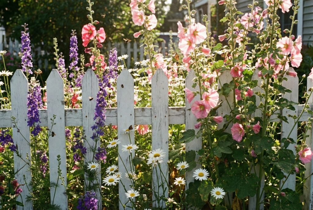 Why it works: The height difference creates depth. Tall plants like Hollyhocks can actually peek over the fence, sharing the beauty with neighbors.